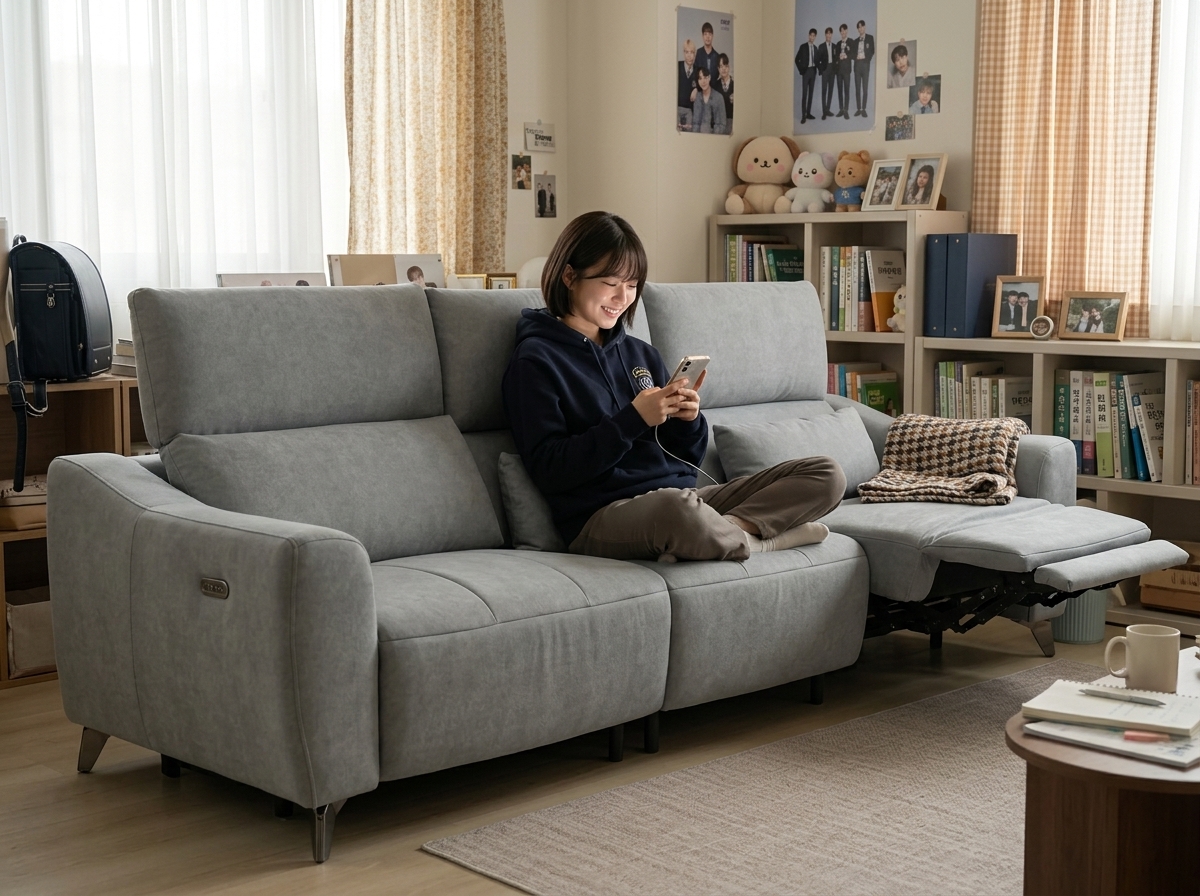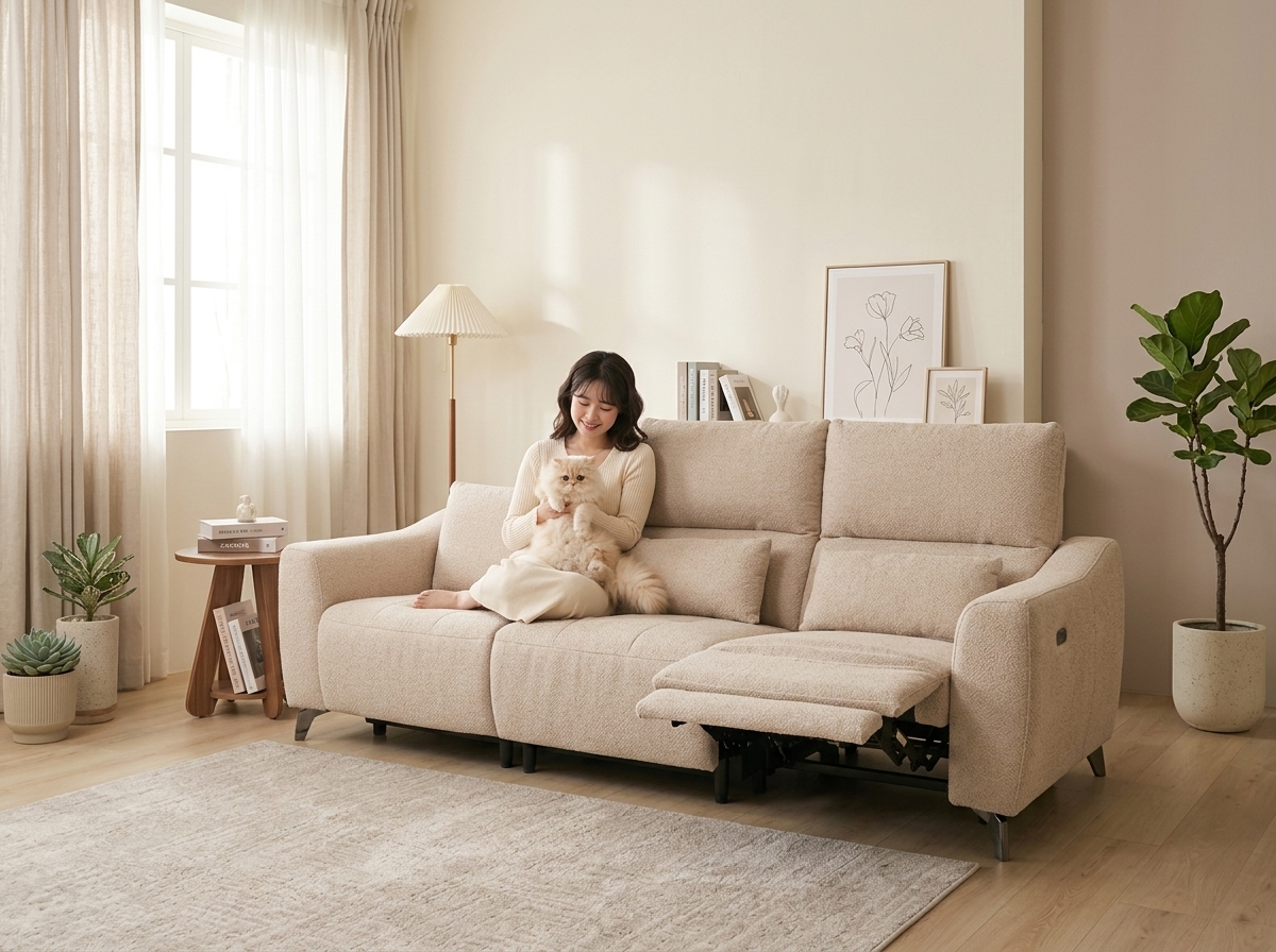主宰自己的慵懶節奏!座椅側邊電動按鈕一鍵延伸腳托與調整背靠角度(*參考舊圖 image_1.png*)。電動馬達滑順安靜,從坐著、半躺到完全放鬆,無段式輕鬆找到最理想的舒適角度,在家享受一個人的優雅慵懶時光。